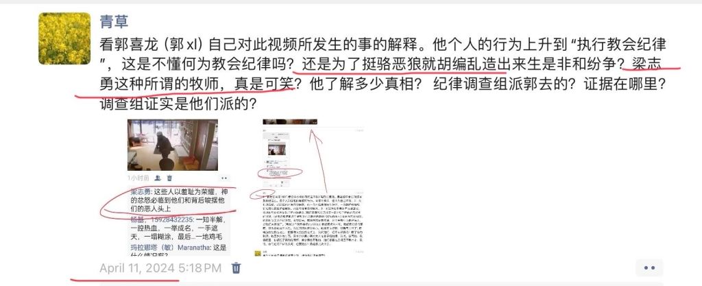 崔常看到骆满嘴污言秽语攻击他人,但至今就没看到他把骆的污言秽语截下来示众和给予公开的谴责,反而还和骆恶狼这位污秽不堪的邪教教主你来我往、遥相呼应。下面是截自崔的朋友圈,2024年4月3日(或4月4日)崔转发了陈鸽的一篇文章是有关教会纪律的,截图如下: