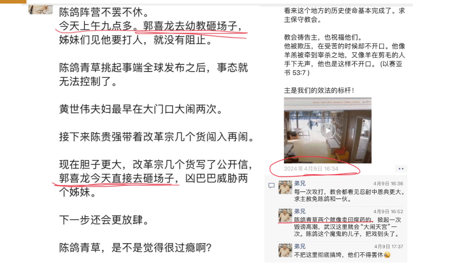 崔把骆发的这个视频加上注解,说是,“利用流氓执行教会纪律,算是开了一个历史先河!” 在评论里崔还说,“为了执行教会纪律,纪律调查组派了一个流氓到人家早教中心去打砸。”