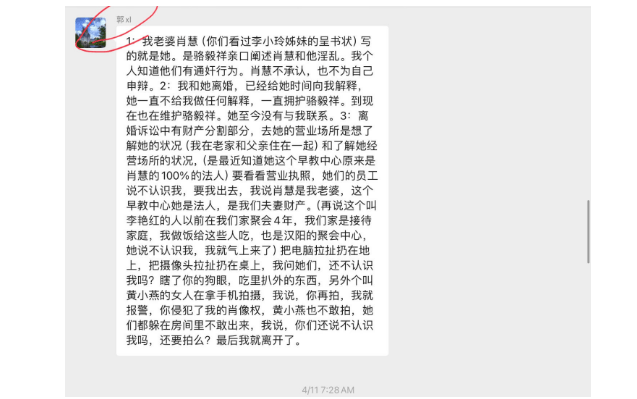 2024年4月9日,骆某人在微信朋友圈发了个视频,说郭去幼教中心砸场子,截图如下: