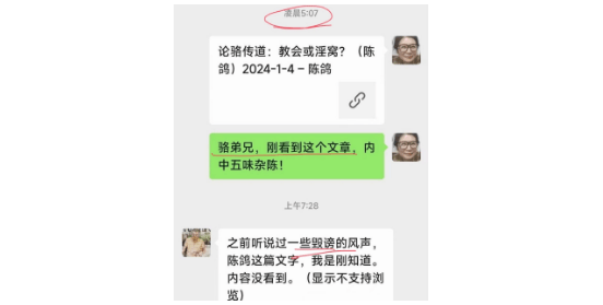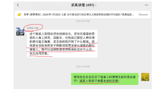 在骆某人长期犯淫乱罪被曝光之后,随着一份由周新贤主持的听证会的会议纪要流露到网络上,很快的就有人声称周新贤是三自的,然后再进一步控告陈鸽和我与三自勾结和联合等等罪名出来。2024年1月21日我已在文章《陈鸽与三自毫不相干!驳骆某人的恶毒毁谤和反扑》里说明了,无论周新贤是不是三自,都与陈鸽和我参与对骆的罪恶的揭发毫无关系,更谈何勾结和联合?下面是举报人之一的陈贵强弟兄在群里的公开证明: