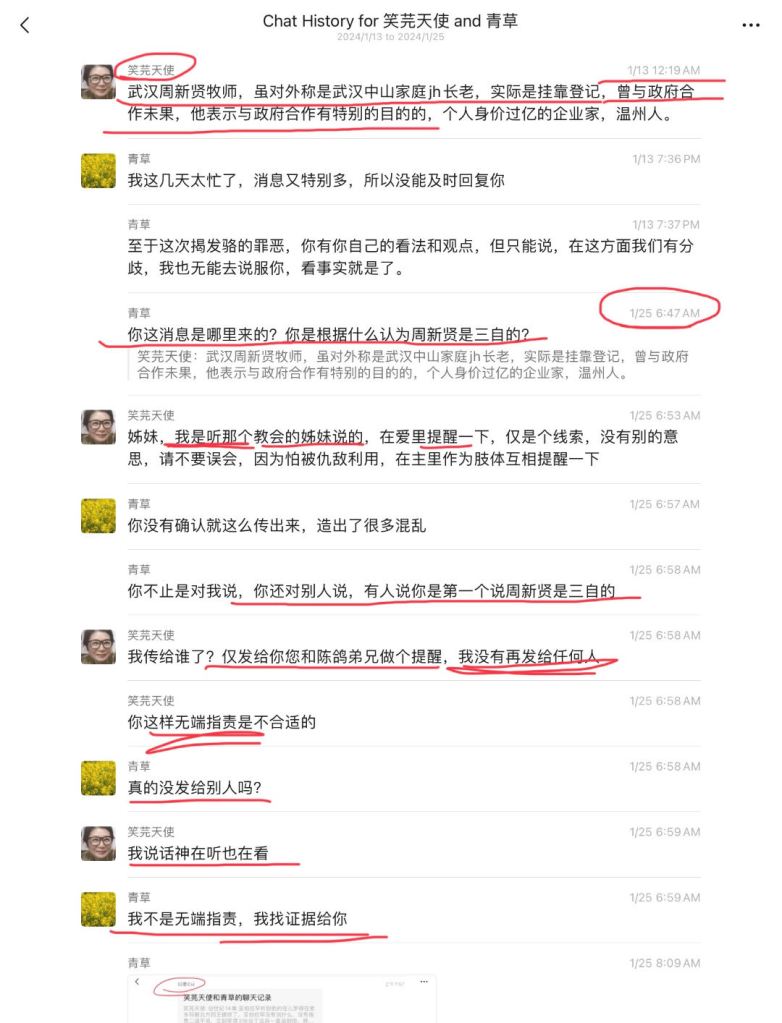 前两天(2024年1月25日),星星姊妹在群里解释说,周新贤的武汉教会不是三自的,他们还有同工因反对加入三自被关。她的原话如下: