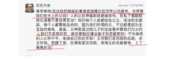 到了骆某人的种种恶行被揭露出来不少之后,2024年1月12日笑芫天使还在我的朋友圈留话,反对我把骆和胡秀平的一些事公开出来。她质问我,这样会荣耀神吗?我倒想问她,难道要把骆和胡的罪恶掩盖起来才会荣耀神吗?她还说,我们不是审判官,我们没有资格审判。言下之意,我们是没有资格公开揭露和谴责骆某人一伙的罪恶。下面就是笑芫天使给我留的评论截图: