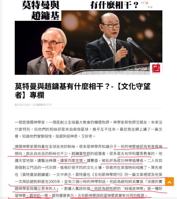 有意思的是,莫特曼还和韩国的成功神学大师赵镛基是好友,莫特曼还声称赵镛基的神学和他的“盼望神学”是一样的。看下面的报道截图。赵镛基的成功神学是异端,是虚假的成功。莫特曼的“盼望神学”是虚假的盼望,确实与成功神学有相同之处,都是虚假和骗人的异端!