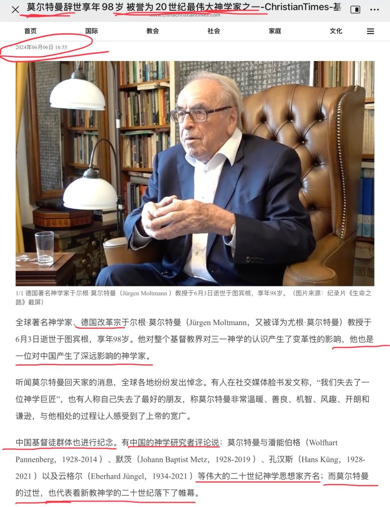 被称之为当代最有影响力的德国神学家莫特曼(JÜRGEN MOLTMANN,也译为:莫尔特曼)前几天(2024年6月3日)以98岁的高龄离世,看到一些人和媒体对他的纪念和吹捧,下面就是一篇这样的报道截图: