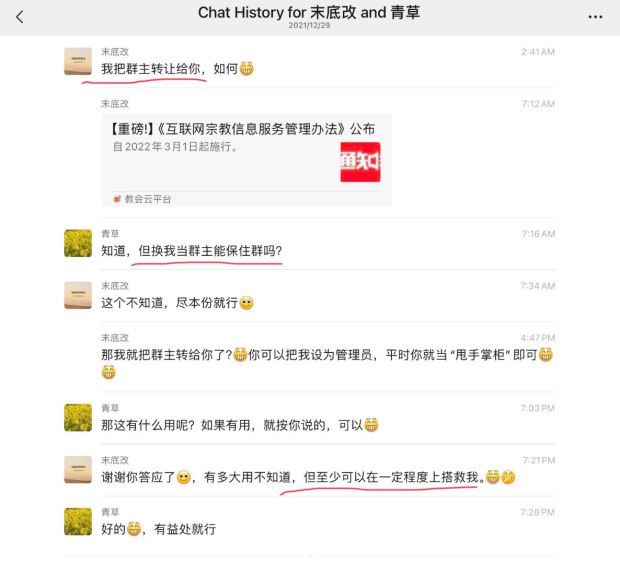 有几年时间(大约是2019年初 — 2022年9月)我是在黄强的“比拉迦”群里,这是个大约90人左右的群。2021年12月,黄强让我当群主,但原因不是我想当,而是为了答应他的请求。因为当时他看到了网络要执行新的管理法,当时有些人已经把群关闭了。黄强对他自己担任群主也有担心,这我也理解。因为我在海外,他让我替他担风险,对我来说,风险应该是会比较低,不致于带给我太大的麻烦,所以我也就答应了。下面截图就是我们当时的对话: