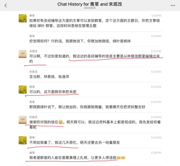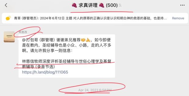 2022年11月,我建了“求真讲理”群,和几位弟兄姊妹一起同工合作管理群。2023年4月底,一位弟兄把黄强(末底改)拉进群,他进群后就推荐了林慈信的录音,当时我没有任何的反对意见。下面的群聊和私聊截图就是证明: