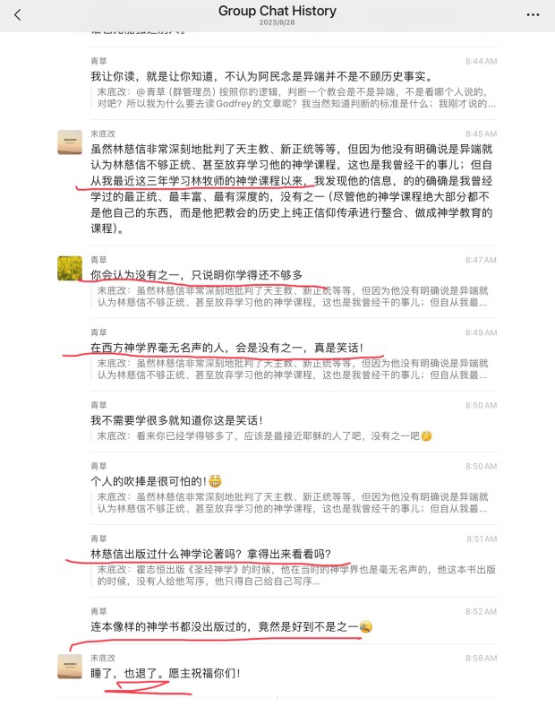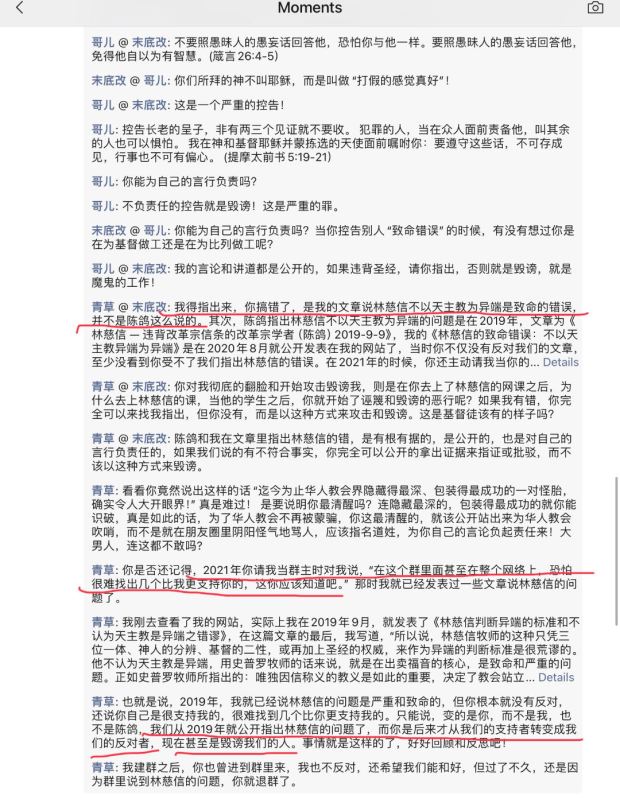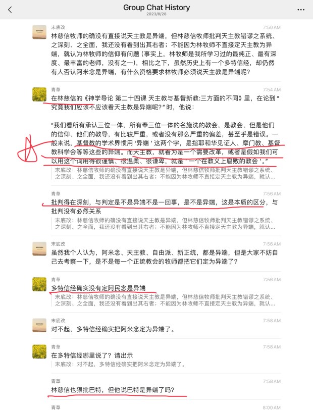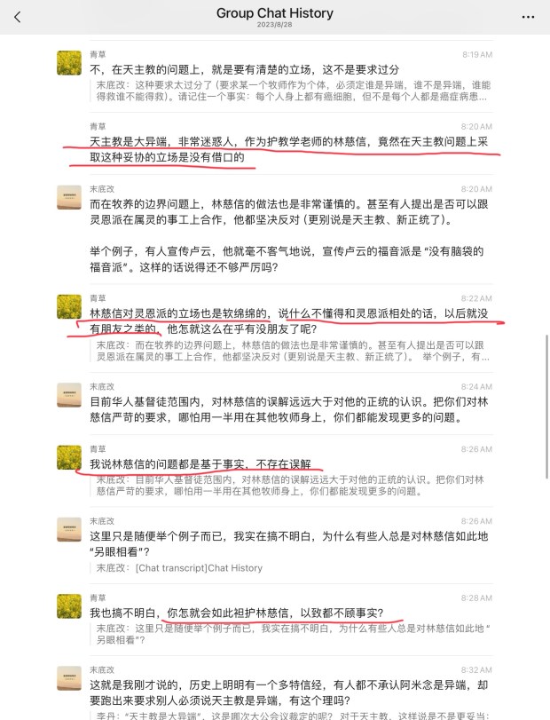 附图:2023年8月20日黄强(末底改)与和我在“求真讲理”群里,就林慈信的问题所发生的争辩的记录截图