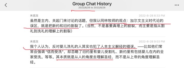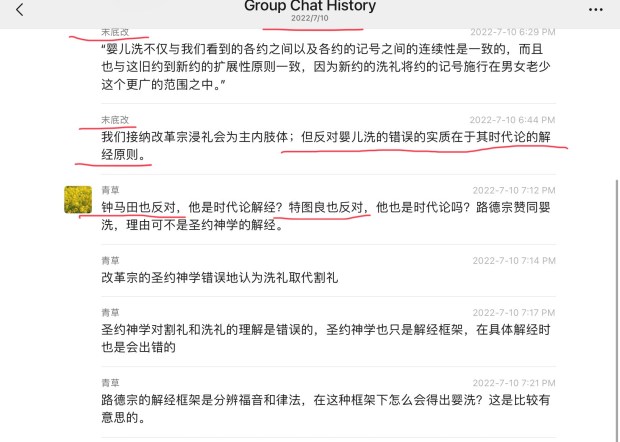 后来,黄强一直致力于为林慈信的网课打广告,也越来越像个华人极端改革宗人士的样子,在群里常因为林慈信的问题,婴儿洗礼,和阿民念的问题争论不休。甚至嘲讽和论断反对婴儿洗礼的人,下面截图就是2022年7月,8月 他在群里挑起的婴儿洗礼的争论,以及我对他的反驳: