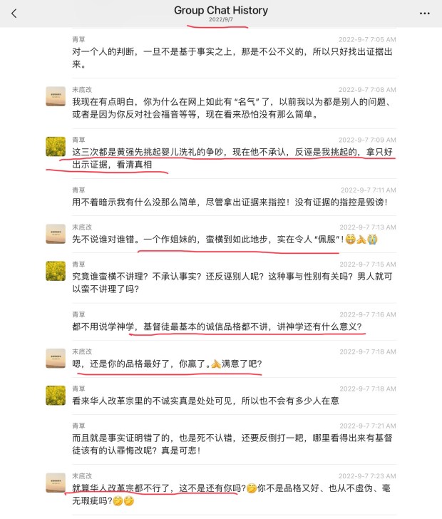 接连几次都是黄强先在群里挑起婴儿洗的纷争,过后又怪是我挑起的,我只好出示证据,证明是他挑去的。面对证据,他不是认罪道歉,而是阴阳怪气地讽刺和挖苦我。也就是在那时(2022年9月),我把群主退回给他,随之自动离群。当时的一段群聊记录如下: