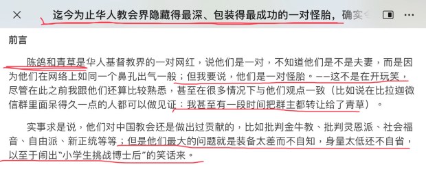 今天(2024年6月12日)看到黄强(微信昵称:末底改)发表的文章:《迄今为止华人教会界隐藏得最深、包装得最成功的一对怪胎,确实令人大开眼界!》,这篇文章是在针对陈鸽和我,把我们说成是“迄今为止华人教会界隐藏得最深、包装得最成功的一对怪胎。” 文章的前言部份截图如下: