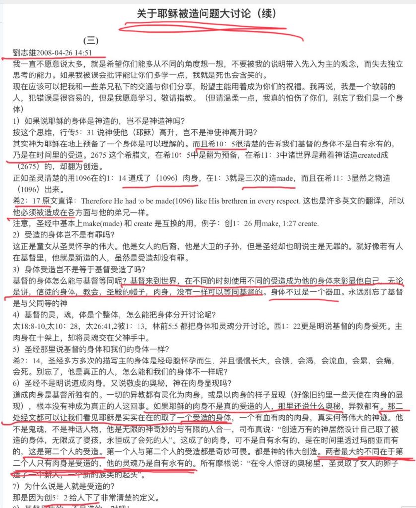 附图:2008年刘志雄为耶稣是被造的所做的一些辩护言论