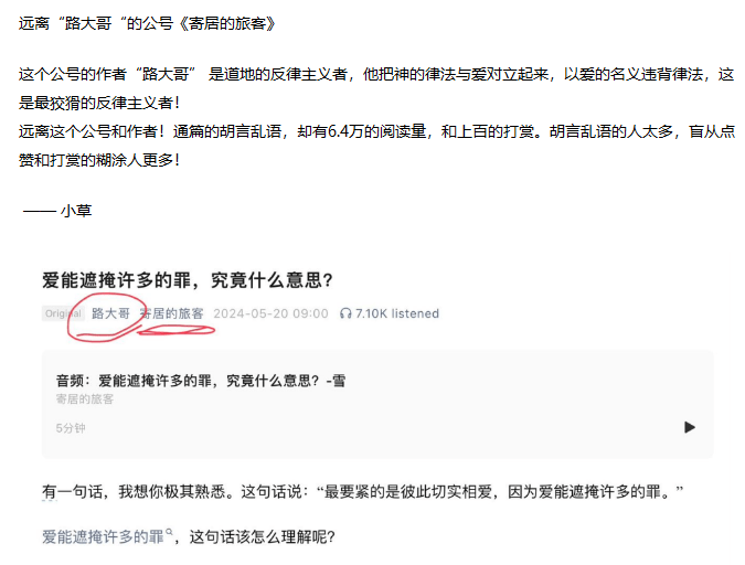 事实证明,这位“路大哥” 一再地以错误的、甚至是异端的观念在给人“解惑”,并收取打赏,这是极其不负责任的行为。作为读者,要谨慎选择自己所阅读的,否则在网上乱摸乱看,迟早被蛇咬!
