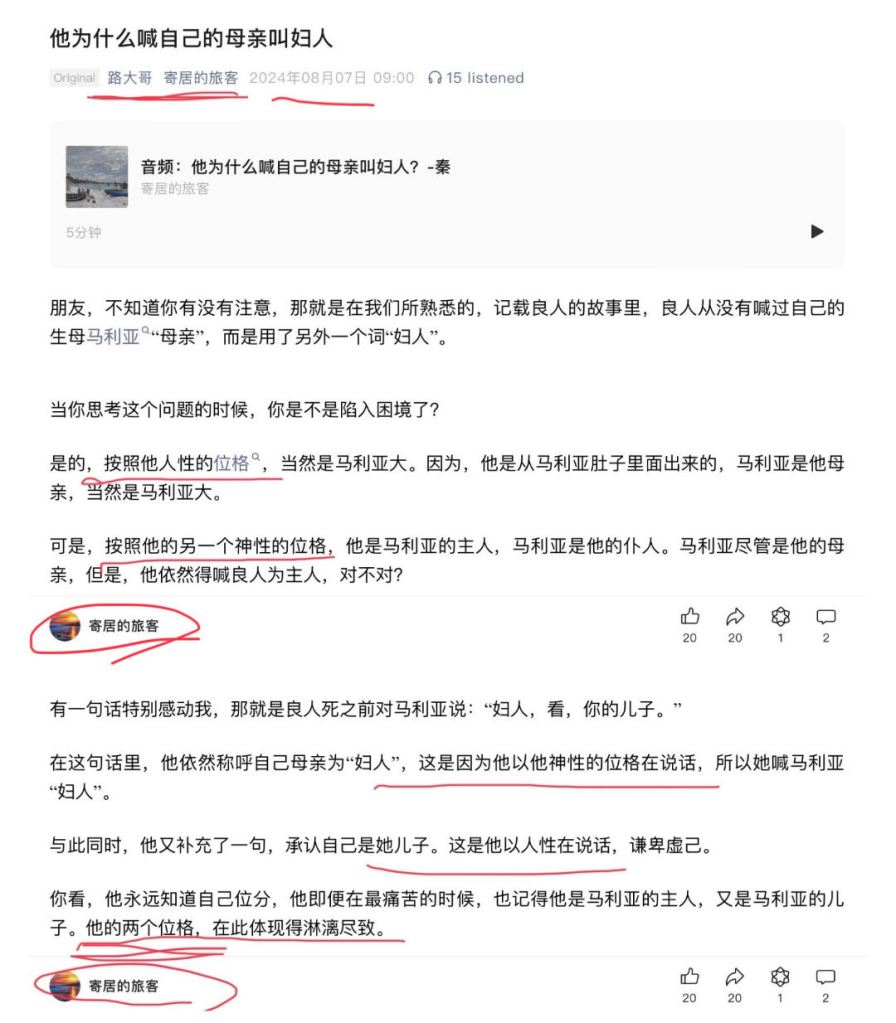 “是的,按照他人性的位格,当然是马利亚大。因为,他是从马利亚肚子里面出来的,马利亚是他母亲,当然是马利亚大。可是,按照他的另一个神性的位格,他是马利亚的主人,马利亚是他的仆人。马利亚尽管是他的母亲,但是,他依然得喊良人为主人,对不对?。。。他依然称呼自己母亲为“妇人”,这是因为他以他神性的位格在说话,所以她喊马利亚“妇人”。。。他永远知道自己位分,他即便在最痛苦的时候,也记得他是马利亚的主人,又是马利亚的儿子。他的两个位格,在此体现得淋漓尽致。” (相关文字的截图附在文后)