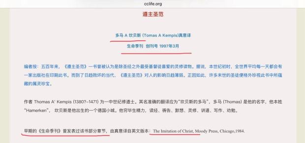 生命季刊设有《尊主圣范系列灵修》栏目,译者为“真意”,从1997年创刊号开始就发表译自坎贝斯的这本《The Imitation of Christ》《尊主圣范》的文章,至今已发表了约20篇,见文后所附截图.