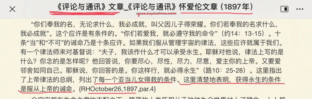 其次,怀爱伦是个律法主义者异端,她谬解和谬用主耶稣和一位律法师的对话,来作为她错谬的根据。她说,“。。。这里指出了上帝律法的总纲,列出了每一个亚当儿女得救的条件。这里清楚地表明,获得永生的条件是服从上帝的诫命。” 原文截图如下: