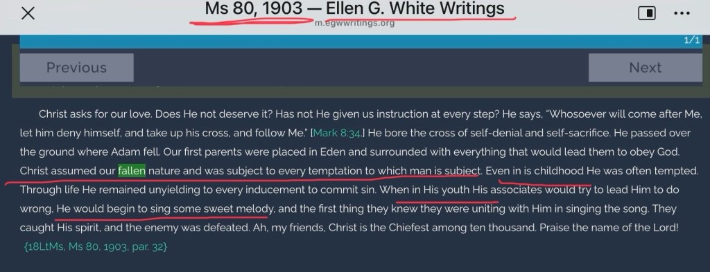1903年,已是到了怀爱伦的晚年,那年她在加州的一次讲道里,又再次声称基督是取了堕落的人性。而且还毫无根据地讲了耶稣在童年时代常受到诱惑,青年时代祂的同伴试图带引导祂去做错事。这纯属是她个人的想象,完全不是出自圣经,可见怀爱伦的话根本就不是安息日所相信的那样:“真理的延伸,可信的资料”。怀爱伦的这段讲道稿的原文截图如下: