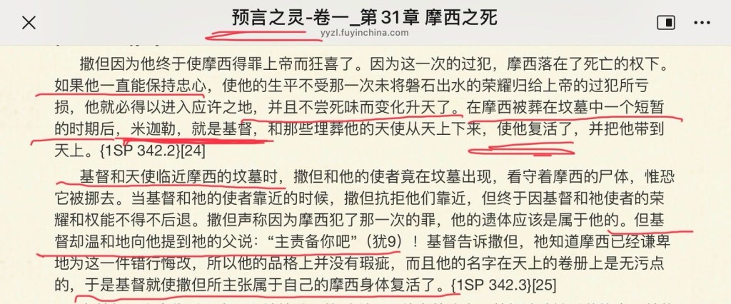 “在摩西被葬在坟墓中一个短暂的时期后,米迦勒,就是基督,和那些埋葬他的天使从天上下来,使他复活了,并把他带到天上。基督和天使临近摩西的坟墓时,撒但和他的使者竟在坟墓出现,看守着摩西的尸体,惟恐它被挪去。当基督和祂的使者靠近的时候,撒但抗拒他们靠近,但终于因基督和祂使者的荣耀和权能不得不后退。撒但声称因为摩西犯了那一次的罪,他的遗体应该是属于他的。但基督却温和地向他提到祂的父说:“主责备你吧”(犹9)!基督告诉撒但,祂知道摩西已经谦卑地为这一件错行悔改,所以他的品格上并没有瑕疵,而且他的名字在天上的卷册上是无污点的,于是基督就使撒但所主张属于自己的摩西身体复活了。” 原文截图如下: