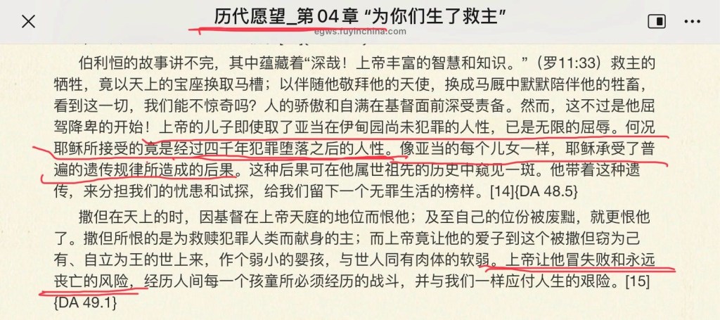“上帝的儿子即使取了亚当在伊甸园尚未犯罪的人性,已是无限的屈辱。何况耶稣所接受的竟是经过四千年犯罪堕落之后的人性。像亚当的每个儿女一样,耶稣承受了普遍的遗传规律所造成的后果。这种后果可在他属世祖先的历史中窥见一斑。他带着这种遗传,来分担我们的忧患和试探,给我们留下一个无罪生活的榜样。” 原文截图如下: