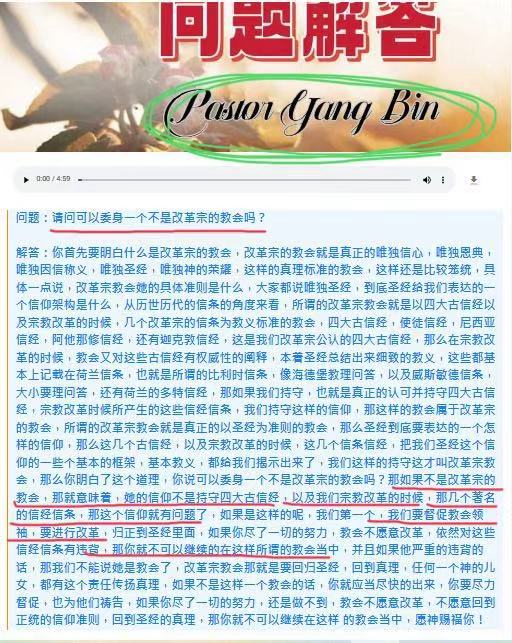 杨斌说,“如果不是改革宗的教会,那就意味着,她的信仰不是持守四大古信经,以及我们宗教改革的时候,那几个著名的信经信条,那这个信仰就有问题了,如果是这样的呢,我们第一个,我们要督促教会领袖,要进行改革,归正到圣经里面,如果你尽了一切的努力,教会不愿意改革,依然对这些信经信条有违背,那你就不可以继续的在这样所谓的教会当中。。。”