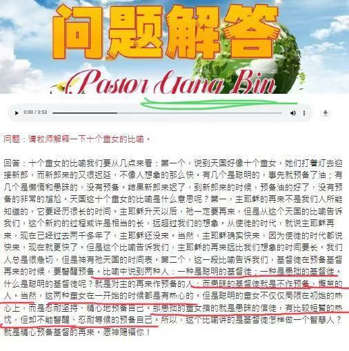 对于十个童女的比喻,杨斌牧师的解释是,这十个童女是说到两种基督徒,一种是聪明的基督徒,另一种是愚拙的基督徒。他说,聪明的基督徒就是对主的再来作预备的人,而愚昧的基督徒就是不作预备。
