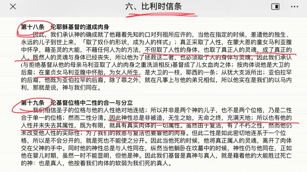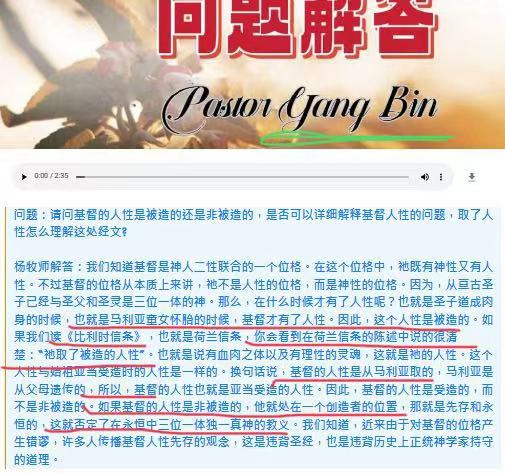 杨斌说,“《比利时信条》,也就是荷兰信条,你会看到在荷兰信条的陈述中说的很清楚:“祂取了被造的人性”。” 请问,《比利时信条》哪条里有说“祂取了被造的人性”? 一些支持基督人性受造的人说,《比利时信条》第19条里说基督取了受造的人性,但这不是事实!下面就是赵中辉牧师翻译的《比利时信条》第18条和19条,里面都没有说基督取了受造的人性,而是说,