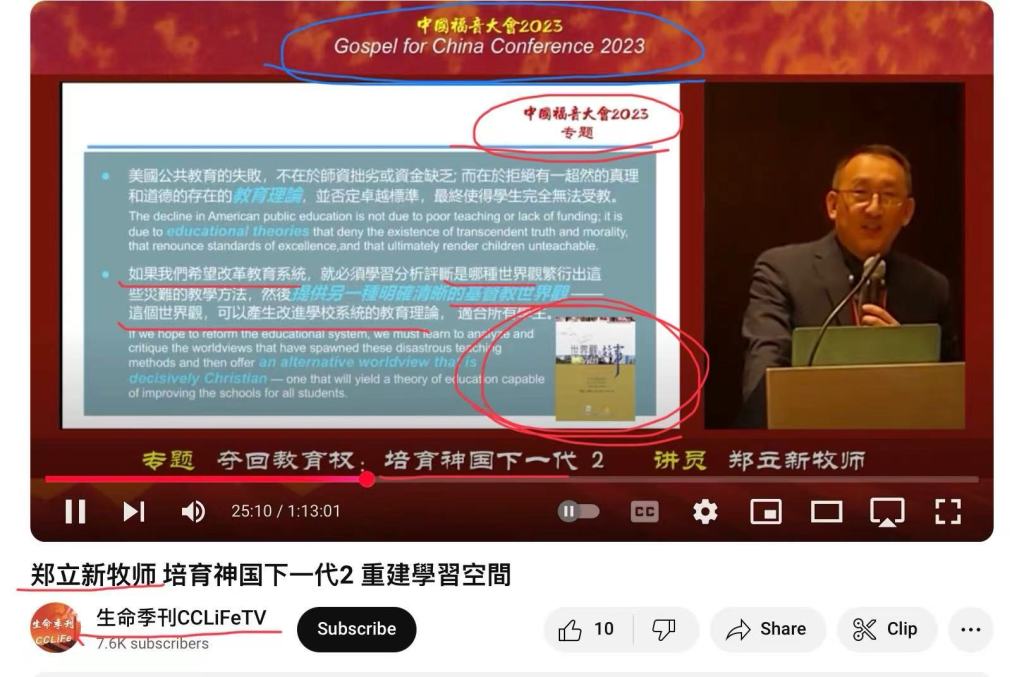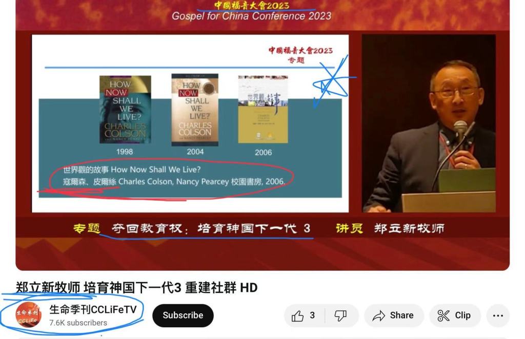 几年前开始,灵恩派的郑立新牧师(2010年 – 2021年的纽约灵粮堂牧师,属灵恩派大本营的台北灵粮堂分堂)开始打着“夺回教育权”,“抢救下一代”,“培养神国下一代”,“在家教育”,。。。等名号,四处竭力去推荐寇尔森的这本《世界观的故事》,并以这本书作为他培训课程的教材。2023年生命季刊的福音大会也请他当大会的讲员,他在每一堂(共有3堂)都在推荐这本书及书里的一些内容。下面就是几张视频截图: