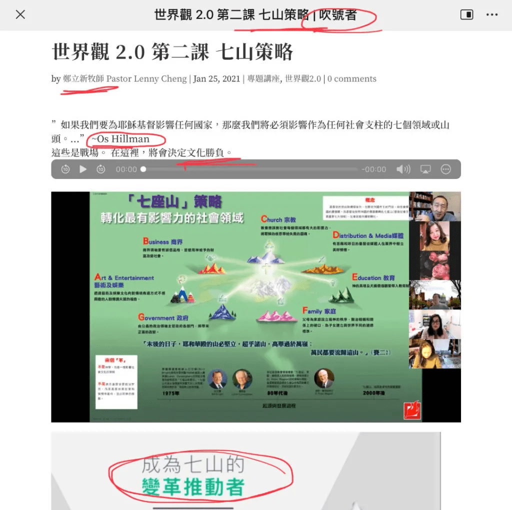 什么是七山策略?“七山策略的支持者呼吁基督徒夺回七个文化影响领域(或山头):宗教、家庭、政府、教育、媒体、文艺/娱乐、和商业。” (引自《灵恩派的七大山头策略是错误的(POYTHRESS,小草译)》)。在上图里可看到郑立新还引述了 Os Hillman(奥斯·希尔曼) 所说的,“如果我們要為耶穌基督影響任何國家,那麼我們將必須影響作為任何社會支柱的七個領域或山頭,這些是戰場。 在這裡,將會決定文化勝負。” 这位奥斯·希尔曼是位极力推动“七山策略”的灵恩派的假使徒,也是NAR(新使徒改革)的成员。七山策略图的右下角是彼得魏格纳(Peter Wagner),是灵恩派里的假使徒的头目(参阅《远离假先知:彼得.魏格纳,雷克.乔纳,恰克.皮尔斯》)