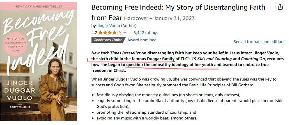 在19位孩子里排在第6位的 Jinger Duggar(1993年 – )如今也已结婚,她的丈夫是 Jeremy Vuolo, 他们夫妇是约翰.麦克阿瑟教会的成员, Jeremy Vuolo 有参与教会和神学院的事工。2023年,Jinger Duggar 出版了一本书《Becoming Free Indeed: My Story of Disentangling Faith from Fear》(真正得到自由: 我将信仰与恐惧分开的故事)。书的封面和简介图示如下: