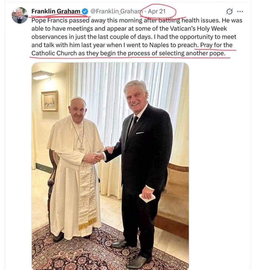我自己也有看到葛福临(Franklin Graham)发表在推特上的那段话和他与方济各的合影,下面就是截图: