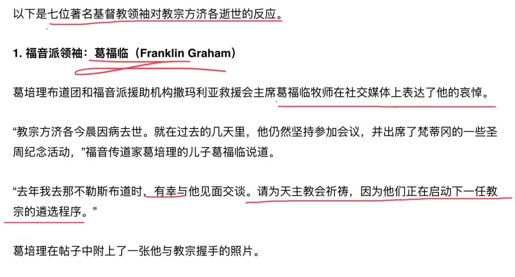 译后注: 我不知道作者 Tim Challies 在文章开头所说的,“有些新教徒利用教宗去世的时机表达他们对教宗和他的职位的关心 ,甚至讨论他的永恒归属。 ” 是在指哪些人。但我自己是有看到一篇中文报道《美国七位基督教领袖对教宗方济各逝世作出回应》,排在首位的是葛培理的儿子葛福临。截图如下: