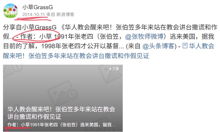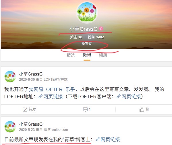 现在网上还能看到我十几年前留下的一些足迹,比如下面就是我十几年前用过的新浪微博的首页截图,从中就可看到:基督徒,作者:小草,2014年我发表的揭发张伯笠撒谎的文章 。。。。 由于约在2020年6月之后就无法登录这个号了,我就放弃没再用了。