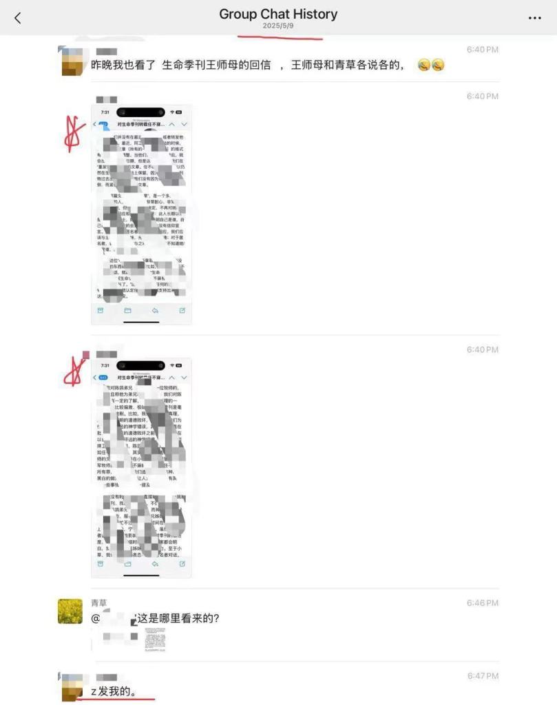 昨晚上(2025年5月9日),生命季刊私下发给 Abigail 的更多的文字部分被人发到微信群里,共有两张截图。我问发图的人这是从哪来的?他说是 Z 发给他的,也就是 Abigail 私下传发给他的。我不知道,Abigail 私下发给了多少人?但绝对不会只是这么一个人! 下面就是当时就此事在群里对话的部分记录截图: