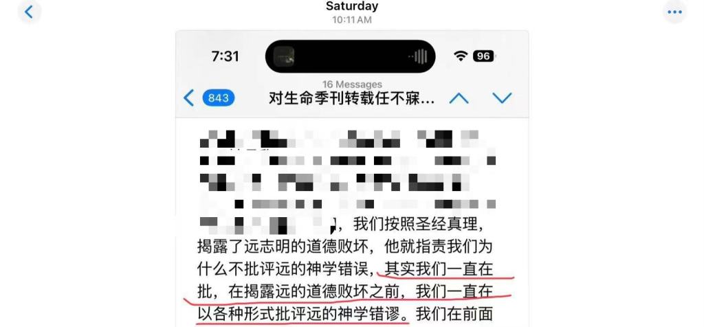 生命季刊还声称“在揭露远的道德败坏之前,我们一直在以各种形式批判远的神学错误。” 看下面生命季刊发给 Abigail 的部分文字截图。