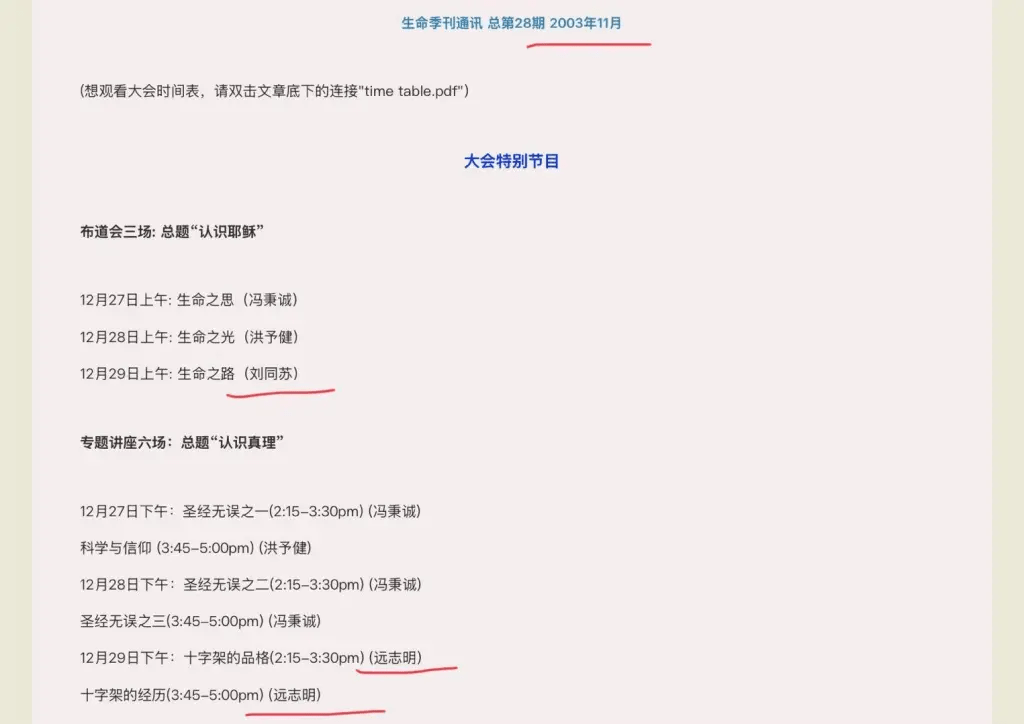 2003年,生命季刊举办福音大会,远志明是讲员。看下面2003年福音大会节目安排截图: