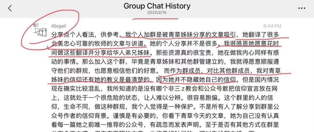再看看Abigail 今年2月份在群里说的,“我个人加群是被青草姊妹分享的文章吸引,她翻译了很多北美忠心可靠的牧师的文章与讲道。她的个人分享并不是很多。我很感恩她愿意花时间做这些翻译并分享给华人弟兄姊妹。那些资源真的很宝贵,她在做我内心同样有感动的事情。那么加入这个群,毕竟是青草姊妹和其他群管建立的,我就得愿意顺服遵守他们的群规,也愿意相信他们的好意。 而作为群成员,对比其他群成员,我对青草姊妹的信仰还有她的教义是最清楚的,因为她并不隐藏她自己的信仰。。。。” 原文字截图如下: