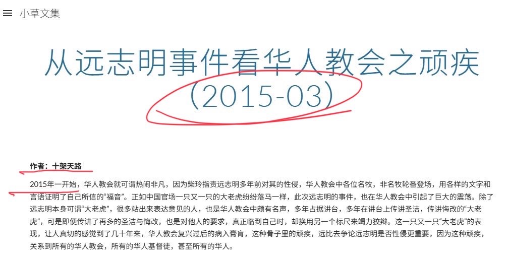 由于我当时用的新浪博客被关闭了,现在已经无法看到我的博客,但是绝大多数的文章被我保留在我个人的谷歌网站《小草文集》上。当时我还保留了一篇我的新浪博友(十架天路)在2015年3月写的有关远案的文章《从远志明事件看华人教会之顽疾 (2015-03)》,看下面文章前面部分截图: