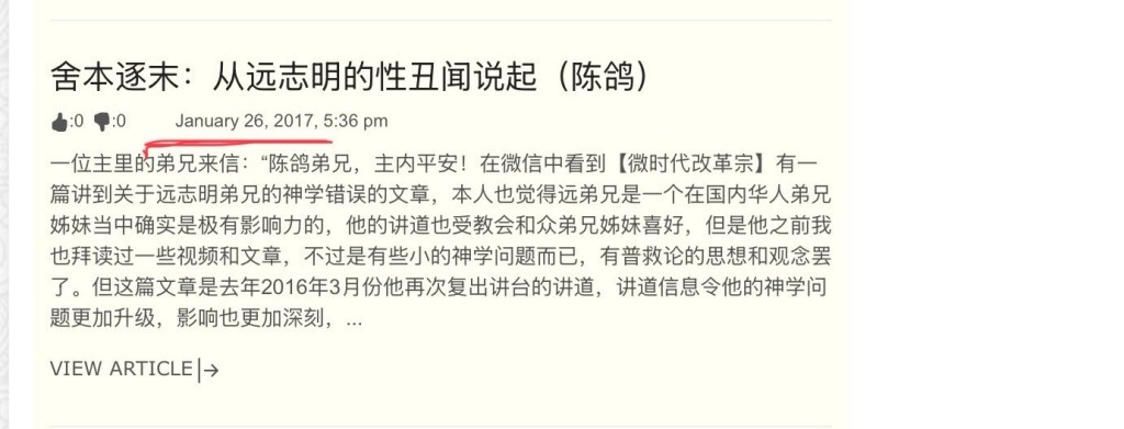 “近期(2016年12月)《生命季刊》又发表了一文:“简析远志明真理认识上的错误”,为此,我很感恩,因为这才是远志明最严重的问题。然而,这篇文章似乎姗姗来迟了。多少的人力、物力、心力,都大量投入在调查他的道德问题上,其实,他真理上的错误,才是一切问题的根源。。。。远志明真道上严重的错谬,不是最近才暴露的,他早年写的《老子VS圣经》和《神州忏悔录》(包括其记录片)早已把他对圣经启示的误解和混合主义的错误暴露无遗。包维理牧师的文章中,有理有据地证明了:远志明自始至终都反对教义和神学,他蔑视圣经的权威与全备,否认“因信称义”的真理,更弃绝“唯独基督”的福音,认为孔孟、老子和未曾听见福音之人也可以得救(我就不在此赘述了)。我个人也曾发表文章,揭露远志明在教义上的大错误,参:《《神州》还是《圣经》(陈鸽:论远志明)》。但令人费解的是:华人教会竟然长期地置若罔闻,不但资深的牧者们正式按立他做牧师,而且各地的华人教会也不断邀请他去布道,因此远志明继续在宗教圈子里,步步高升,青云直上,直到他的性丑闻大曝光,才开始对他口诛笔伐,而且重点是放在他的道德问题上。。。因此《生命季刊》所做的完全没错,然而,问题是:为什么只着重于调查远志明生活作风上的问题,却迟迟才揭露他真道上致命的错谬呢?其实,这才是他问题的关键所在。”