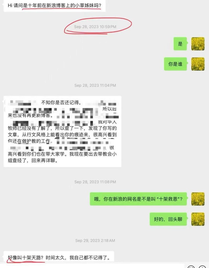 最后说下我和“十架天路”的一个小故事。十几年前我和他是新浪的博友,后来我们的博客都被关闭,他也离开了博客,我们就失去了联系。直到在2023年9月,他通过我的网站找到我,加了我的微信,我们才又联系上。下面就是我们刚联系上的对话截图,出于保护他的隐私,截去他的微信名,也把他的部分文字打码。这也证明,我转发的《从远志明事件看华人教会之顽疾 (2015-03)》,并非来路不明。