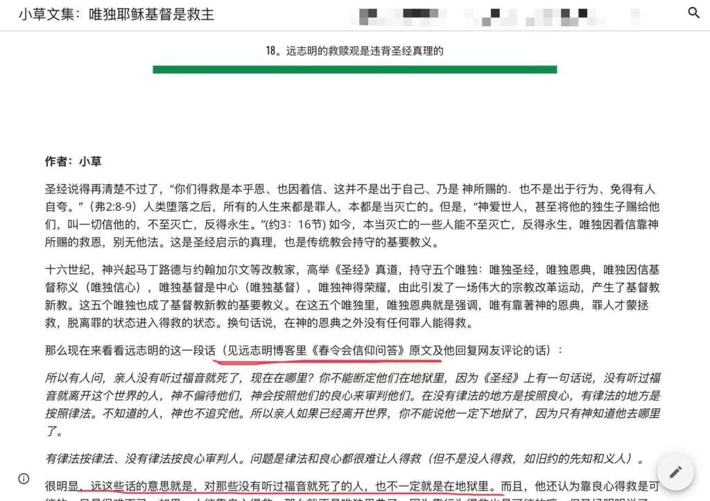 文章所批判的那段“回答”是在远志明2014年5月发表的《春令会信仰问答》里,也发表在他的新浪博客上。当时我在他的博客上看到后,就写了一文《远志明的救赎观是违背圣经真理的》。下面就是我这篇文章的上部分截图: