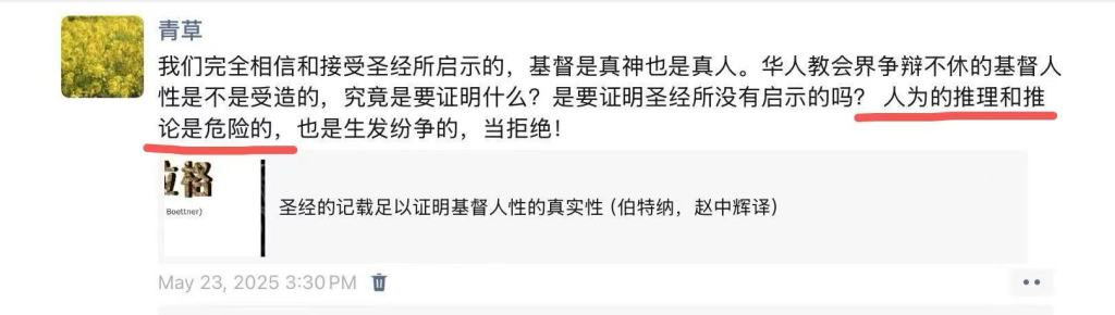 那些主张基督的人性是受造的,是毫无圣经的根据,甚至连大公教会的信经都没有这样的教义。可以说,他们基本上就是用逻辑推理来证明基督的人性是受造,但这样就和李常受的路子是一样的,也会得出李常受的异端结论,而且还有更多的隐患。