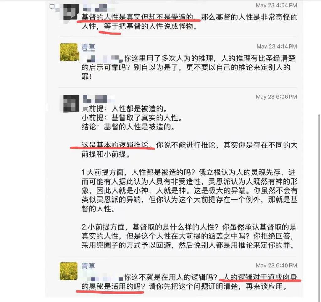 下面就是在我的朋友圈与一位主张基督的人性是受造的人的一段对话截图: