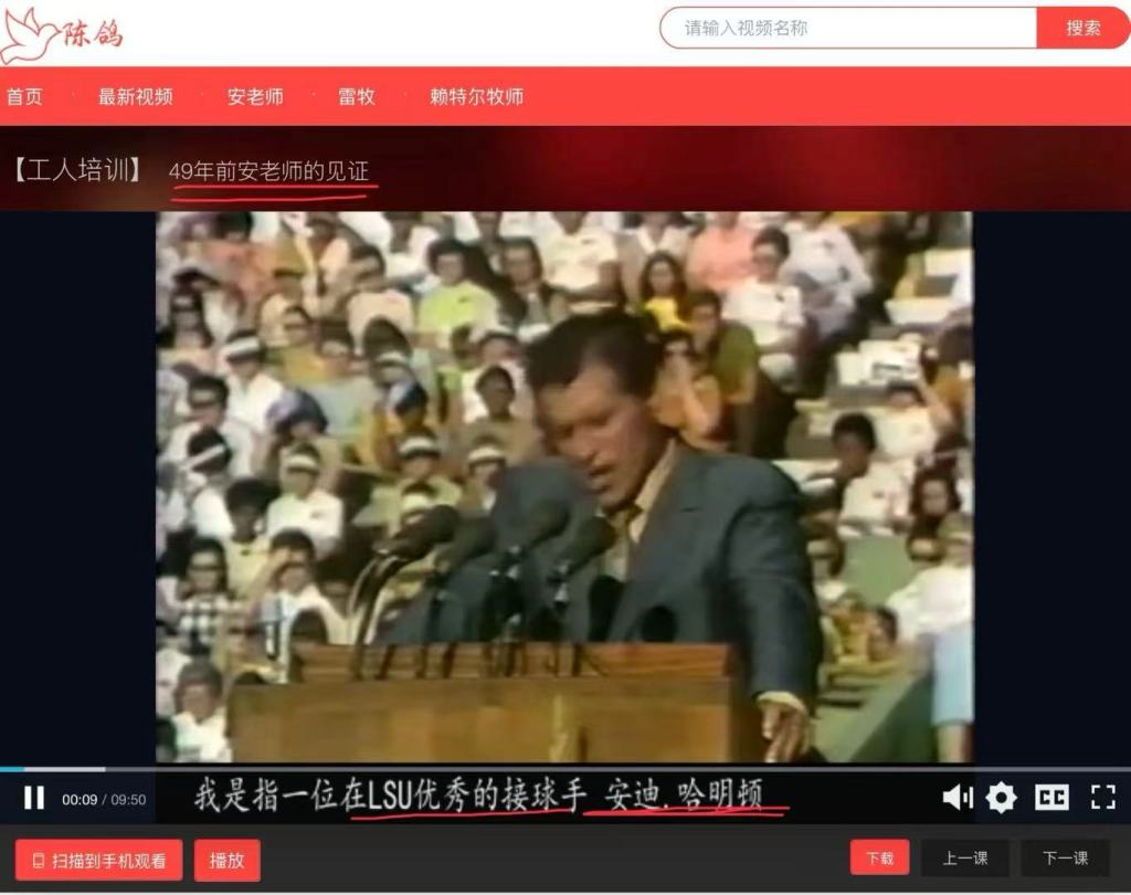 安老师的这次完整的讲话视频,在陈鸽老师的网站上有配中文字母:《49年前安老师的见证》。下面是一个截频图,是主持人正在引介安老师上讲台的画面: