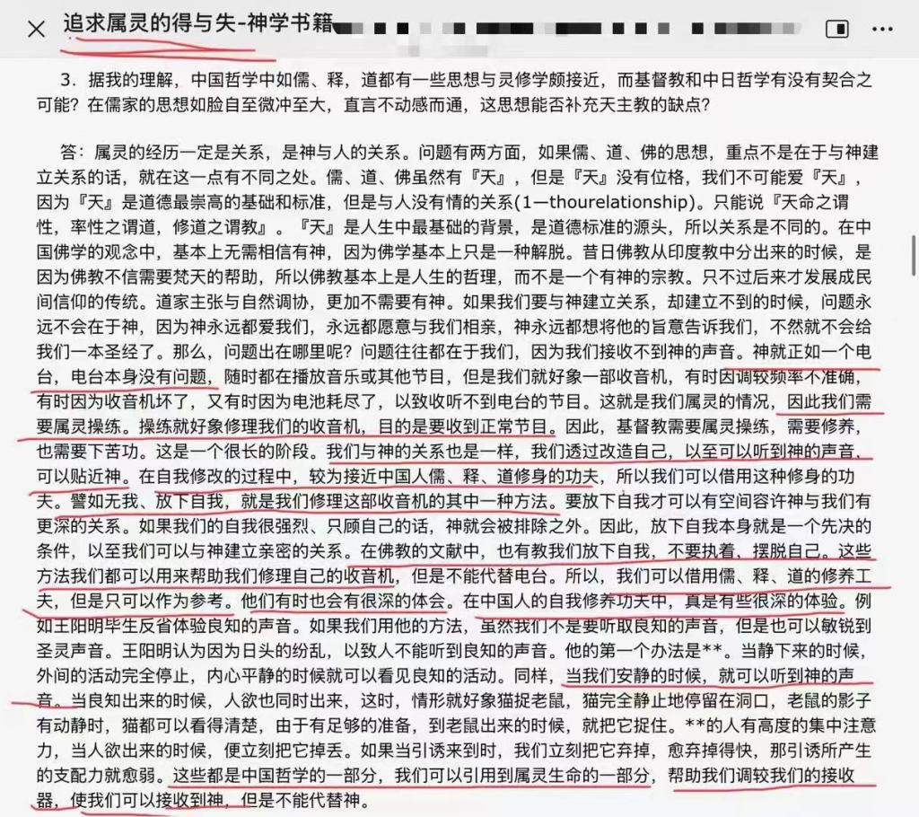 “神就正如一个电台,电台本身没有问题,随时都在播放音乐或其他节目,但是我们就好象一部收音机,有时因调较频率不准确,有时因为收音机坏了,又有时因为电池耗尽了,以致收听不到电台的节目。这就是我们属灵的情况,因此我们需要属灵操练。操练就好象修理我们的收音机,目的是要收到正常节目。因此,基督教需要属灵操练,需要修养,也需要下苦功。这是一个很长的阶段。我们与神的关系也是一样,我们透过改造自己,以至可以听到神的声音,可以贴近神。在自我修改的过程中,较为接近中国人儒、释、道修身的功夫,所以我们可以借用这种修身的功夫。譬如无我、放下自我,就是我们修理这部收音机的其中一种方法。要放下自我才可以有空间容许神与我们有更深的关系。如果我们的自我很强烈、只顾自己的话,神就会被排除之外。因此,放下自我本身就是一个先决的条件,以至我们可以与神建立亲密的关系。在佛教的文献中,也有教我们放下自我,不要执着,摆脱自己。这些方法我们都可以用来帮助我们修理自己的收音机,但是不能代替电台。所以,我们可以借用儒、释、道的修养工夫,但是只可以作为参考。他们有时也会有很深的体会。在中国人的自我修养功夫中,真是有些很深的体验。” (原文截图附在文后)