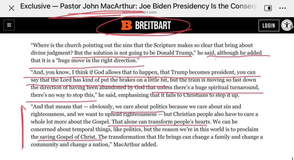 麦牧接着又说,“这意味着–显然,我们关心政治是因为我们关心罪与公义,我们想要维护公义–但基督徒应该更加关心福音。只有福音能改变人们的心灵。我们可以关心暂时的事,比如政治,但我们来到这个世界的原因是为了宣扬基督救赎的福音。基督所带来的改变可以改变一个家庭,改变一个社区,和改变一个国家。” 可见,麦牧清楚地重申,唯独福音才能改变人心,唯独基督才能改变家庭、社区、和国家,而不是政治。根据麦牧这些话,还怎么会认为他严重地依附于政治呢?