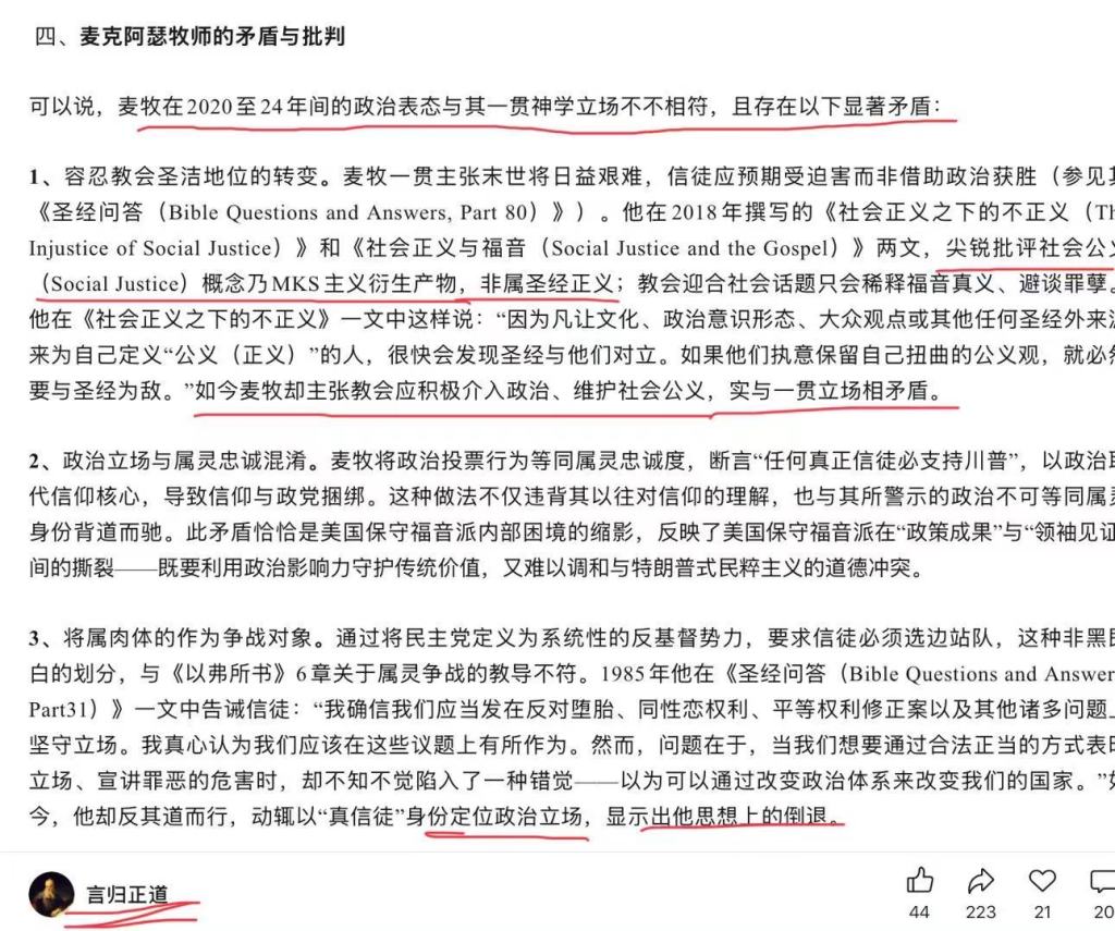 请先搞清楚麦牧所批的社会公义是什么?那根本就不是麦牧所说的“使用一切的努力来保持社会的公义,因此当我有这样的机会时,比如上法庭、或者以选票来选出较公义、尊崇上帝、愿意惩恶扬善的一方,我就应该去投选那个比较符合圣经原则的一方。”