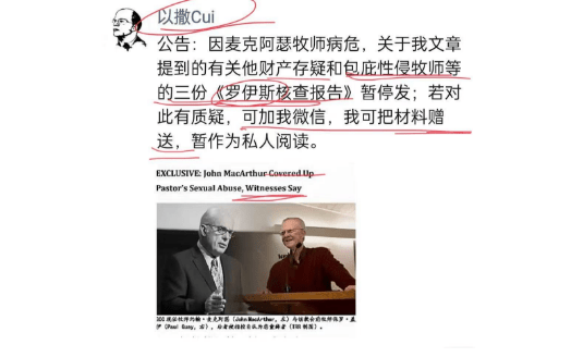 2025年7月13日 恩典教会(GCC)告知麦克阿瑟牧师很快就要回天家了,当时崔以撒在他的朋友圈里发了条消息,声称可以把他的三份指控麦克阿瑟牧师的《罗伊斯核查报告》私下送人,截图如下: