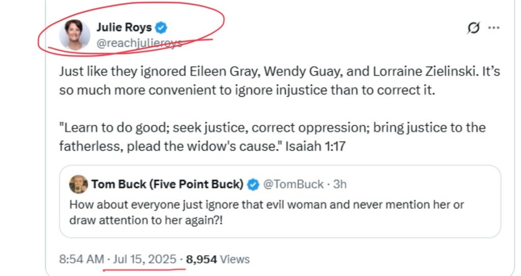 Tom Buck 是美国一浸信会的主任牧师,目睹了罗伊斯(Julie Roys)长期对麦克阿瑟牧师的诋毁和抹黑,2025年7月15日就公开发了一条推文,建议大家忽略“那位邪恶的女人”,不要再去关注她。虽然 Tom没说出这位邪恶的女人是谁,但看的人里很多都知道他是在指 Julie Roys,这从他这个推文后的评论就可知道了,第一位评论者直接就说 Julie Roys,说她自称为记者,但这就好比把盗墓者称为是考古学家。。。