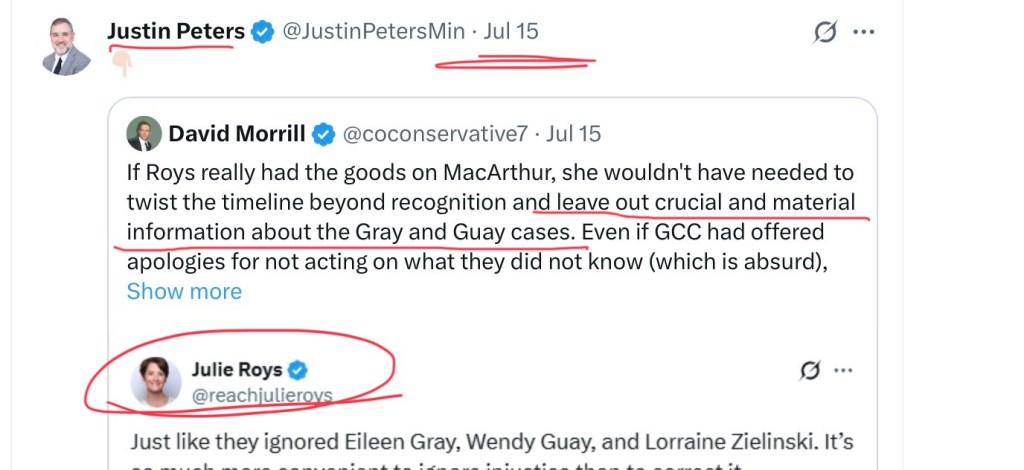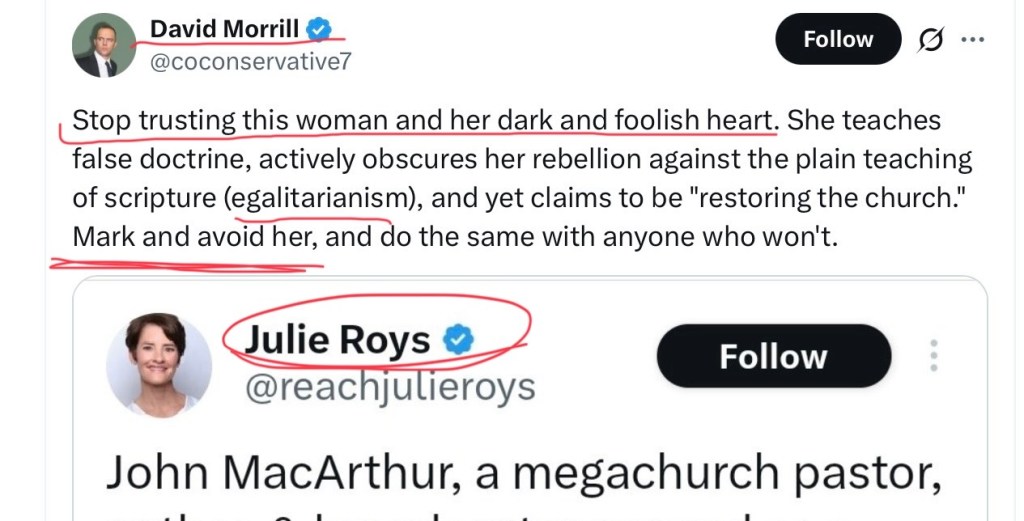 2025年7月15日美国著名的护教人士 Justin Peters 转发了David Morrill 抨击 Julie Roys 的推文,截图如下: