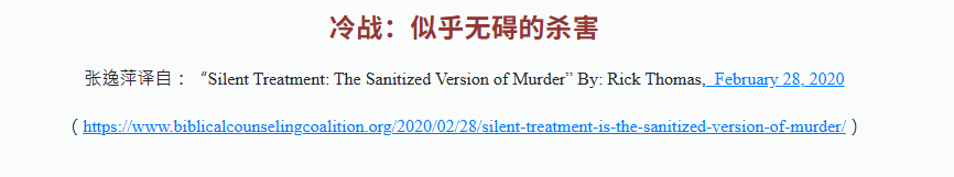 瑞克·托马斯(Rick Thomas)也从事圣经辅导的事工,张逸萍翻译过他的几篇文章。比如,《冷战:似乎无碍的杀害》: