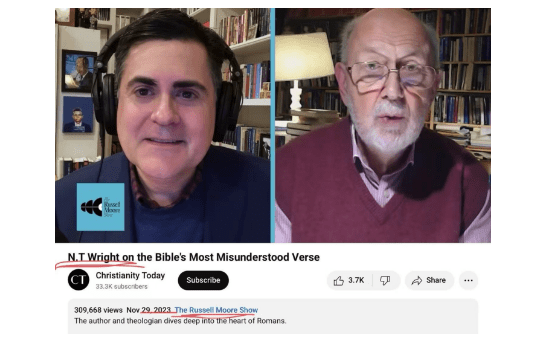 2023年罗素.摩尔(左)还请赖特(右)这位异端分子上他的节目和《今日基督教》来讲解圣经: